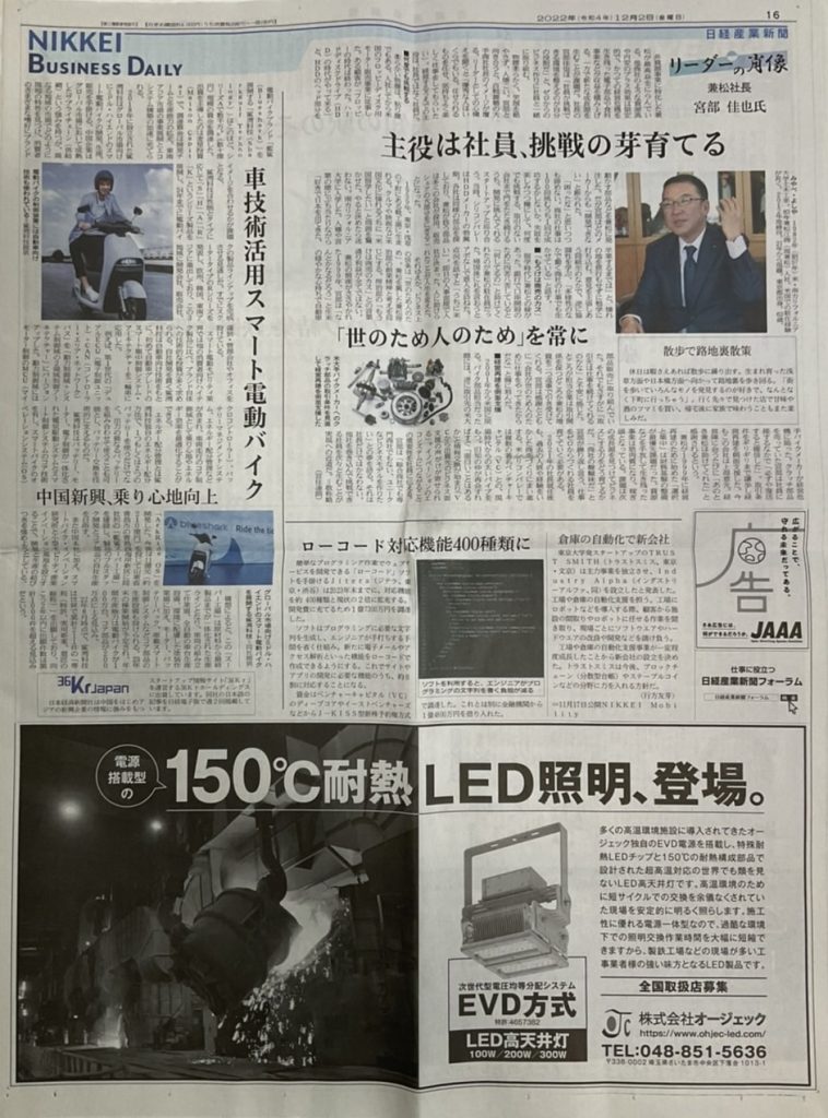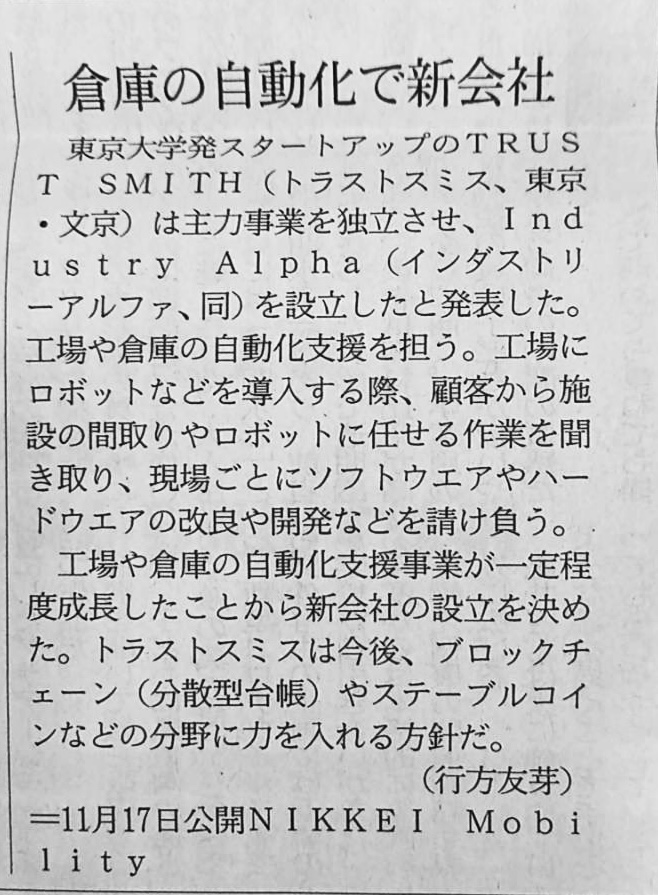 日本経済産業新聞に弊社の紹介コラムが掲載されました 2023 1/14 NEWS 2023年1月12日2023年1月14日 2022年12月2日の日本経済産業新聞で『倉庫の自動化で新会社』というタイトルで掲載されました。是非ご覧ください。 NEWS Industry alpha Industry α インダストリーアルファ 倉庫自動化 よかったらシェアしてね! URLをコピーしました! URLをコピーしました! 【スズキ×Industry α】スマート化に関わる検証を開始 Industry Alpha株式会社が「Microsoft for Startups」に採択されました。 関連記事 「配送系・倉庫のデータ活用によるスマート物流勉強会」共催のお知らせ 2025年5月29日 「倉庫DX実現に向けたスタートアップの革新サービス紹介セミナー」開催報告 2025年5月27日 Industry Alpha株式会社、「第37回中小企業優秀新技術・新製品賞|主催:りそな中小企業振興財団 日刊工業新聞社」において奨励賞を受賞 2025年4月30日 名古屋近辺のベンチャー企業に特化したオンライン経済新聞Nagoya Startup Newsに掲載 2025年4月30日 和製AMR「Kaghelo」第4世代モデルを2025年1月にリリース 2025年1月10日 Industry Alpha株式会社、「第4回 スマート物流 EXPO」に出展 2025年1月9日 フォークリフト作業分析システムの本格展開を開始 2025年1月7日 NEXsTokyo海外展開支援プログラム 第6期に採択 2024年12月20日