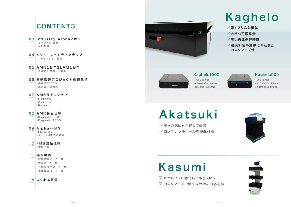 「スマート工場・スマート倉庫をデザインし実現する」というパーパスを掲げ、低床型AMR(Autonomous Mobile Robot:自律走行ロボット)の開発・導入など工場・倉庫のスマート化事業を展開するIndustry Alpha 株式会社(本社:東京都板橋区、代表:渡辺琢実)は、この度、主力商品であるAMRのカタログを全面リニューアルいたします。AMR最新モデルのリリースに伴うイメージ画像の刷新、現場主義の設計を可能にするFMS※1の詳細説明、導入事例の拡充など、全ページを一新します。搬送工程全体の自動化を計画されているお客様に、当社のソリューションがより分かりやすく伝わるよう工夫を施しています。新カタログは公式ウェブサイトよりダウンロード可能です。