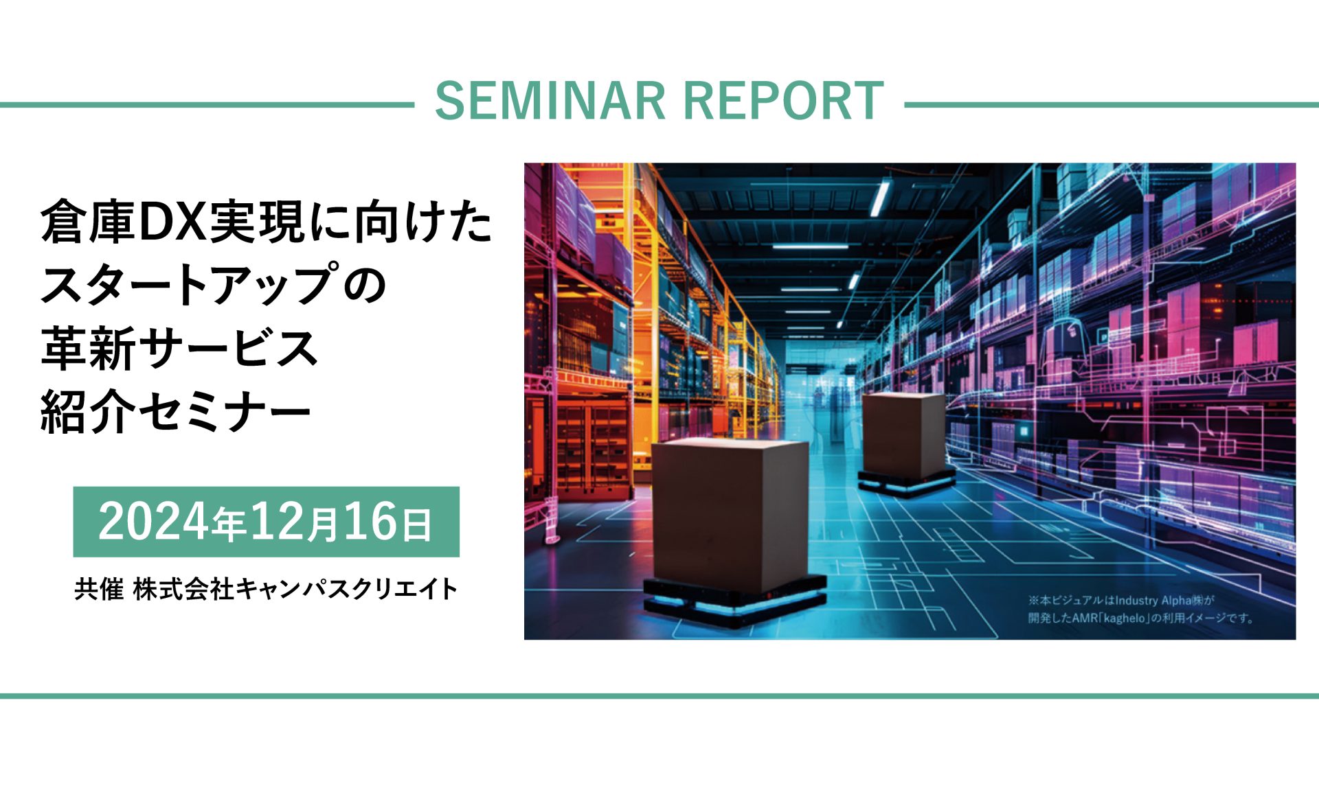 Industry Alpha株式会社(以下、当社)は、2024年12月16日に株式会社キャンパスクリエイトと共催で「倉庫DX実現に向けたスタートアップの革新サービス紹介セミナー~搬送の自動化・ロボット化が拓く物流変革」を東京・京橋のイベントスペースIncubation CANVASにて開催いたしました。